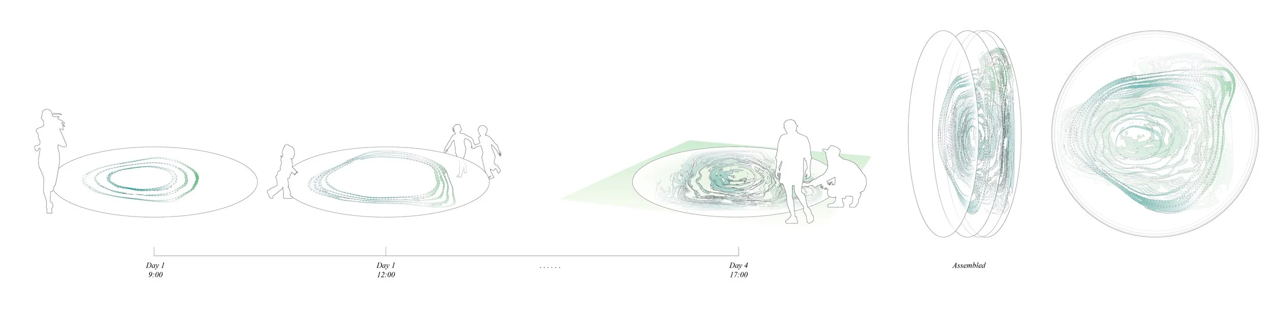 2022 Assembly 是一个追溯Harvard Yard时间维度变化的互动装置。行人的移动通过传感器转换为信号,以印纹的方式被记录下来,在装置表面形成年轮状的图案,不断叠加的纹路表现了环境中潜在的相关性。展览结束后,记录下轨迹的单体会被组装整合为一个雕塑,成为反映时间和身体运动的具象化空间。通过对瞬间的捕捉和对周围环境的呼应,装置为毕业生和参观者们提供了多种解读方式和互动体验。