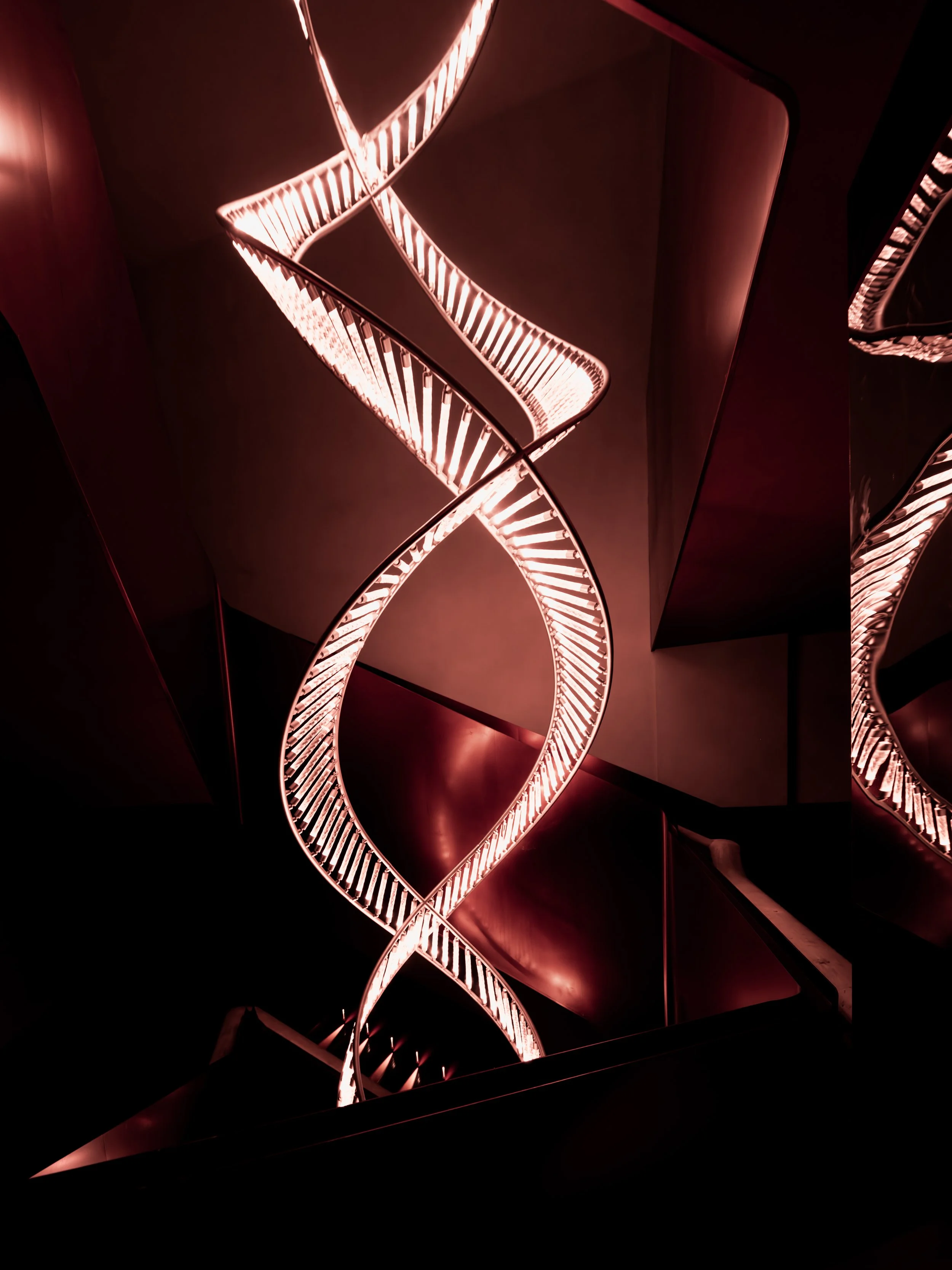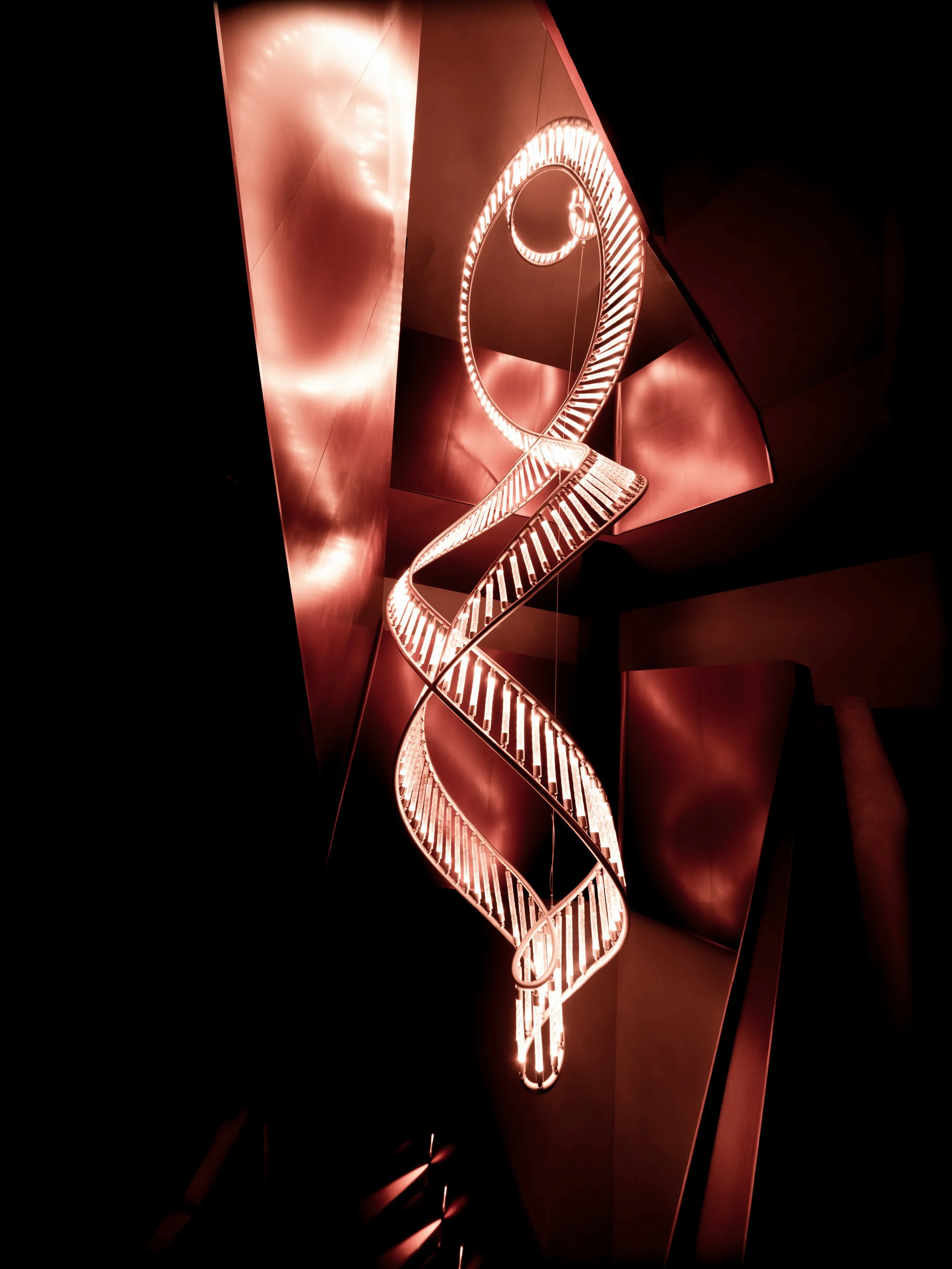 在上海大光明电影院的螺旋楼梯间,艺术装置——《星体螺旋》悬挂其中。灵感源自于行星运转连成的曲线,装置形态与场地相互呼应,犹如一条通往宇宙深处的连接。