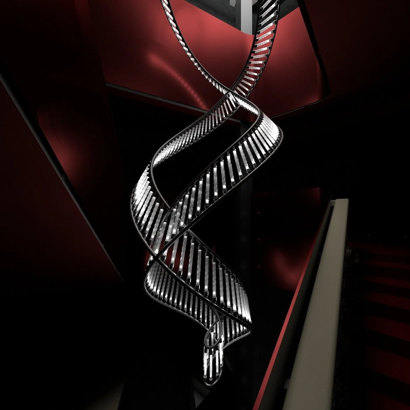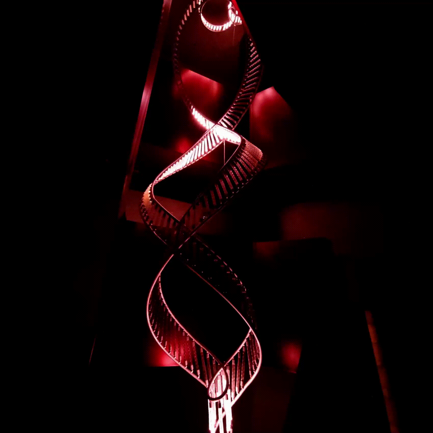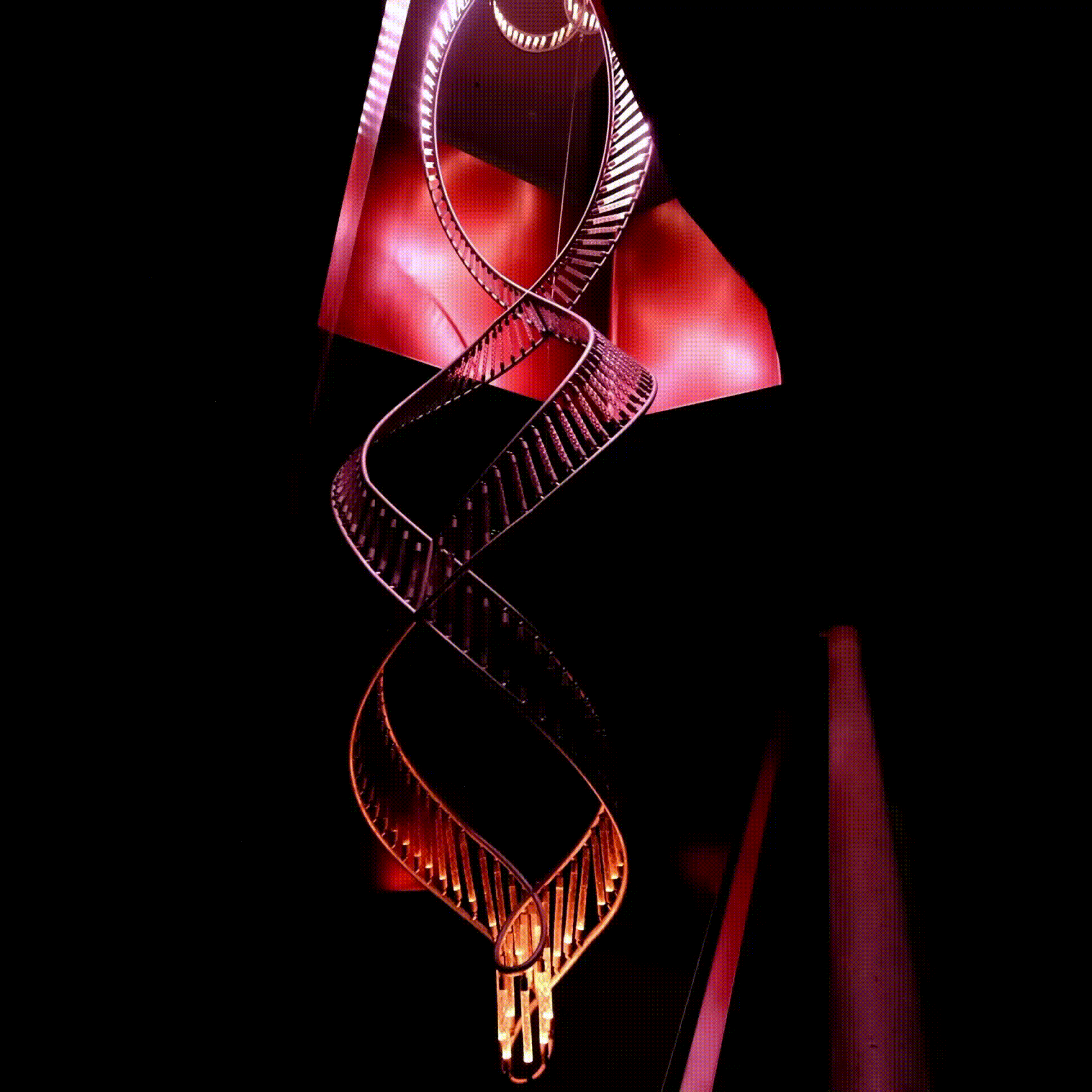 装置的形态概念来自于行星在太阳系中运动行程的轨迹,如果将场地的旋转楼梯想象为星光的必经之路,太阳系正在向前快速移动,行星围绕着它旋转,形成了螺旋,每个行星的转速不同,如果我们行星的位置移动坐标转译为一组数学公式,并将行星之间彼此相连,则会产生这样的图像。
