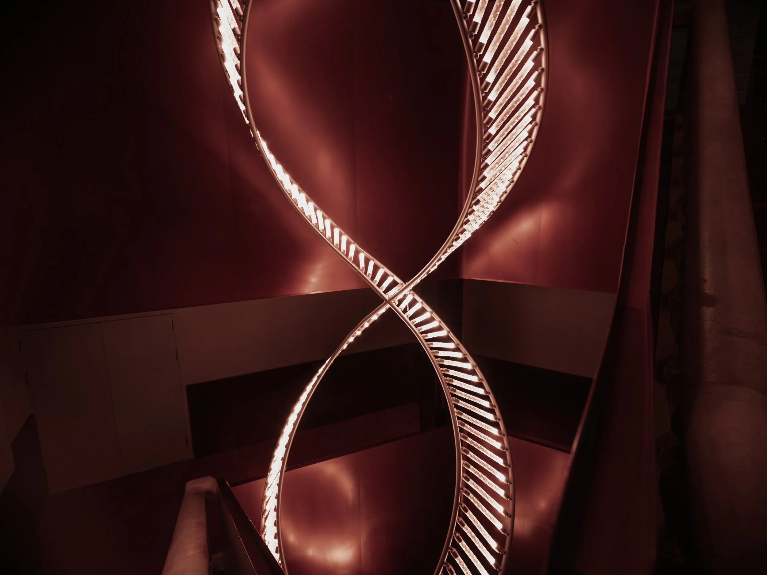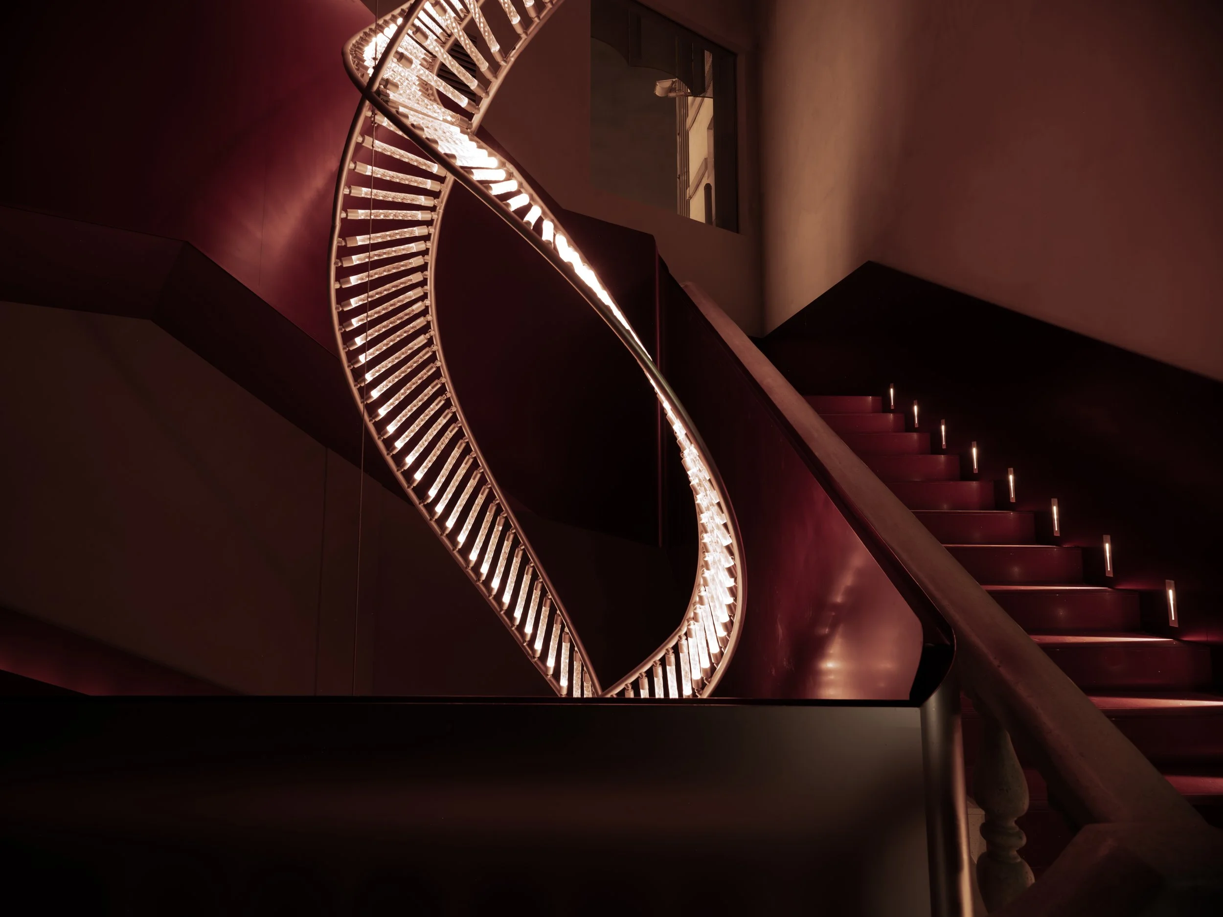 The art installation "Celestial Spiral" is suspended in the spiral staircase of the Grand Theatre. The inspiration for this artwork comes from the curves formed by the orbiting planets, with the installation's shape resonating with the space, like a path leading to the depths of the universe.