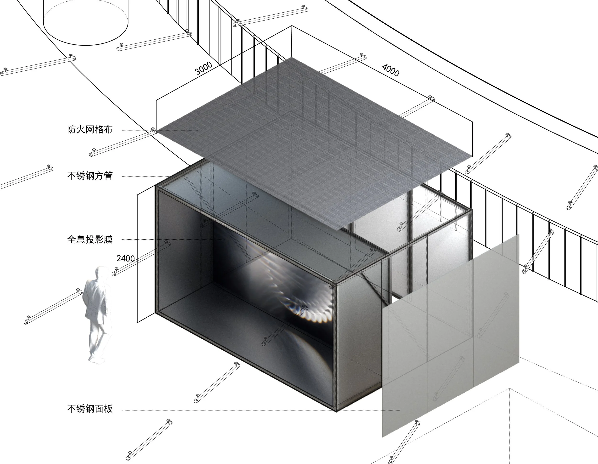 这是一个光学动态装置,可通过计算机模拟技术,产生定制化的光学透镜,精确控制光的折射,来产生不同的折射后的形态。可通过控制 透镜的形态与光线的角度来实现不同的幻影效果。 投影尺寸可变。